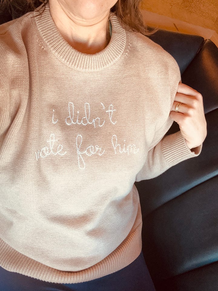 The I Didn’t Vote For Him sweater is a long time fave and feels very necessary when traveling right now (also sometimes just at the grocery store or when meeting new mom friends and trying to figure out if you will hang out with them again).