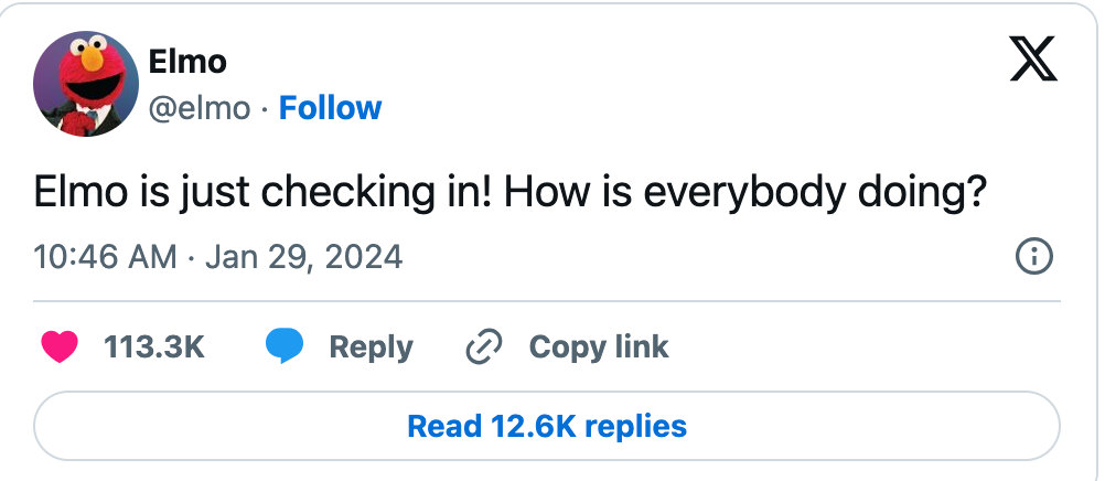 The response to the question was a resounding and viral “not great!” From celebrities to brands and many other users across the platform, folks chimed in to share their despair with Hollywood’s most ticklish friend. Elmo trended up to number one on Twitter and still sits on the trending chart as of the writing of this article as people continue to discuss their woes. The tweet earned nearly 150M impressions.