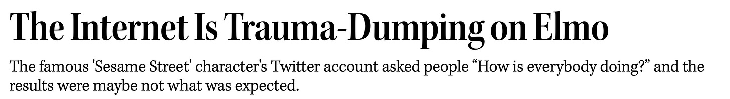 From the ongoing war to corporate layoffs and a bleak-seeming election cycle, no trauma was too shallow nor too deep to share with young Elmo. “Honestly, Elmo, I need a hug,” wrote one user. “Oh Elmo, sweetheart, we are not doing well,” wrote another. “Elmo girl…I’m having a quarter-life crisis right now and I can’t get my [s–t] together to finish this last semester. I’m mentally burnt out and I have a lifetime of working to go,” said another user.
